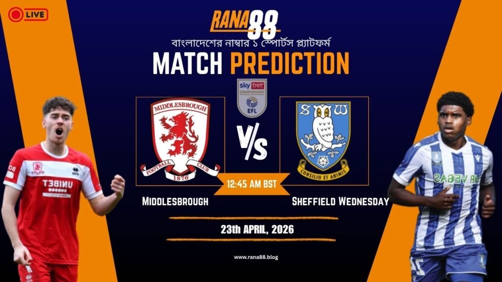 Middlesbrough vs Sheffield Wednesday ম্যাচটি Sky Bet Championship-এর একটি গুরুত্বপূর্ণ লড়াই হতে যাচ্ছে। Middlesbrough নিজেদের মাঠে আক্রমণাত্মক ফুটবল খেলে ম্যাচে আধিপত্য বিস্তার করতে চাইবে, অন্যদিকে Sheffield Wednesday সংগঠিত ডিফেন্স ও দ্রুত কাউন্টার অ্যাটাকের মাধ্যমে প্রতিপক্ষকে চাপে ফেলতে প্রস্তুত। দুই দলই গুরুত্বপূর্ণ পয়েন্ট অর্জনের লক্ষ্যে মাঠে নামবে, তাই ম্যাচটি উত্তেজনাপূর্ণ হওয়ার সম্ভাবনা রয়েছে।