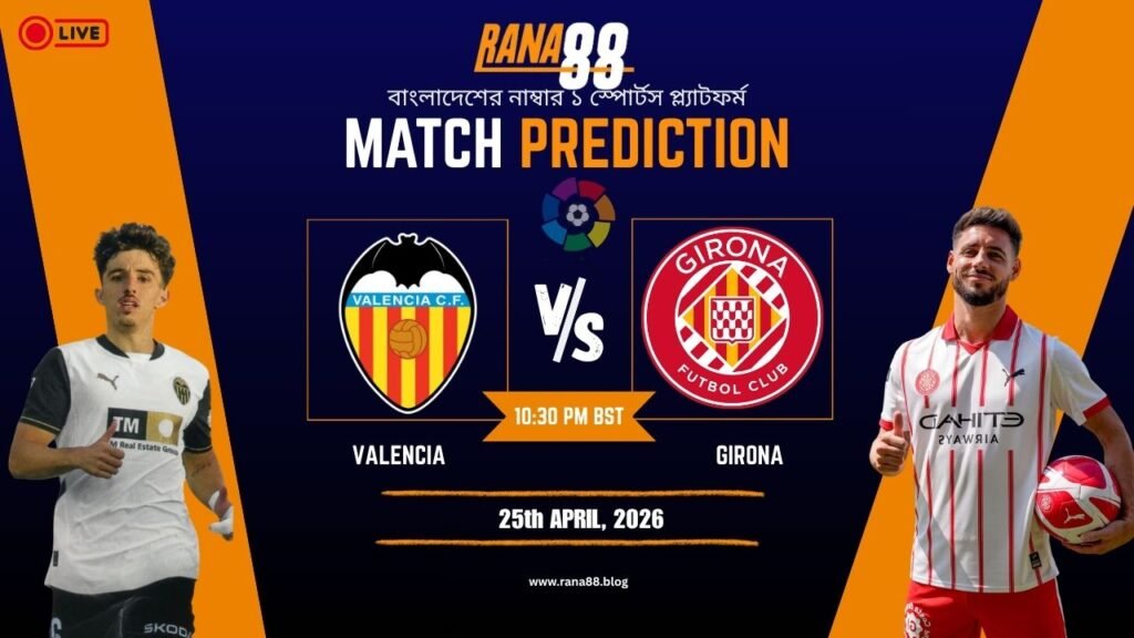 Valencia vs Girona ম্যাচটি লা লিগায় একটি আকর্ষণীয় ও প্রতিদ্বন্দ্বিতাপূর্ণ লড়াই হতে যাচ্ছে, যেখানে Valencia CF মুখোমুখি হবে Girona FC-এর। দুই দলই গুরুত্বপূর্ণ পয়েন্ট অর্জনের লক্ষ্য নিয়ে মাঠে নামবে, যা ম্যাচটিকে আরও গুরুত্বপূর্ণ করে তুলেছে। ভ্যালেন্সিয়া নিজেদের মাঠে সংগঠিত ডিফেন্স ও দ্রুত আক্রমণের উপর নির্ভর করতে পারে, অন্যদিকে জিরোনা তাদের পজেশন-ভিত্তিক খেলা ও আক্রমণাত্মক কৌশলের মাধ্যমে ম্যাচে প্রভাব ফেলতে পারে। তাই ম্যাচটি হওয়ার সম্ভাবনা রয়েছে বেশ উত্তেজনাপূর্ণ ও প্রতিযোগিতামূলক।