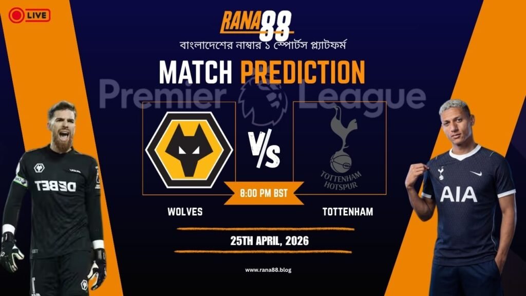 Wolves vs Tottenham ম্যাচটি প্রিমিয়ার লিগে একটি গুরুত্বপূর্ণ ও আকর্ষণীয় লড়াই হতে যাচ্ছে, যেখানে Wolverhampton Wanderers F.C. মুখোমুখি হবে Tottenham Hotspur F.C.-এর। দুই দলই গুরুত্বপূর্ণ পয়েন্ট অর্জনের লক্ষ্য নিয়ে মাঠে নামবে, যা ম্যাচটিকে আরও প্রতিযোগিতামূলক করে তুলবে। উলভস নিজেদের মাঠে সংগঠিত ডিফেন্স ও কাউন্টার অ্যাটাকের উপর নির্ভর করতে পারে, অন্যদিকে টটেনহ্যাম তাদের আক্রমণাত্মক খেলা ও দ্রুত পাসিংয়ের মাধ্যমে ম্যাচে আধিপত্য বিস্তার করার চেষ্টা করবে। তাই ম্যাচটি হওয়ার সম্ভাবনা রয়েছে বেশ উত্তেজনাপূর্ণ ও উপভোগ্য।